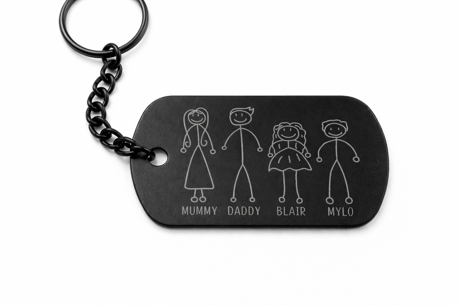 Crafted from durable metal and finished with a matte black powder coating, this dog tag keyring features a laser-engraved family design that will never fade or wear. Each stick-figure character is carefully engraved alongside personalised names, creating a unique piece that feels both modern and sentimental.